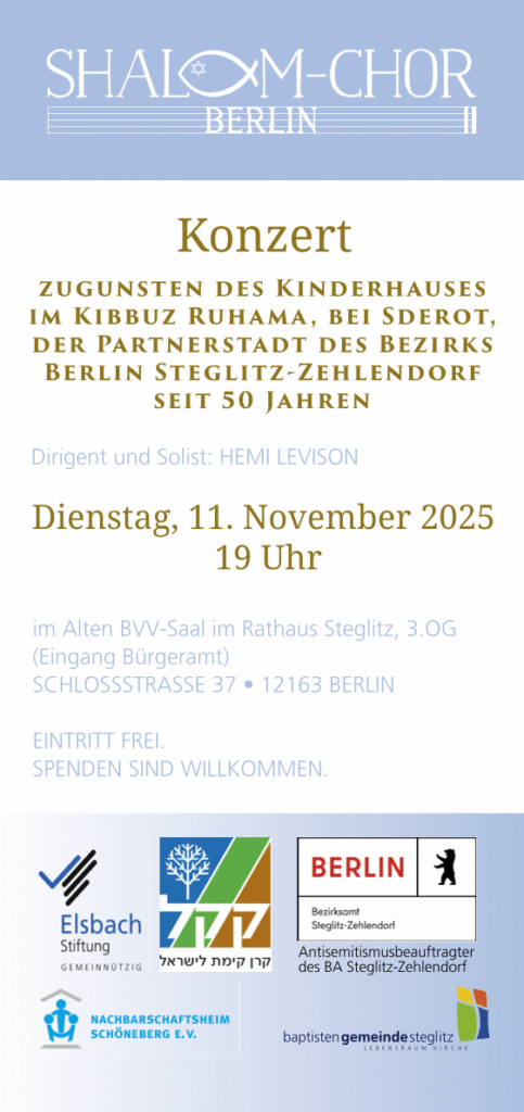Shalom/Salam spiegelt einen Herzenswunsch wider, den kaum jemand mehr verkörpert als der Chor, der ihn im Namen trägt: Unter der Leitung von Kantor Hemi Levison gibt der interreligiöse Shalom-Chor Berlin am 11. November 2025 um 19 Uhr im Alten BVV-Saal des Rathauses Steglitz (Schloßstr. 37, 12163 Berlin, Eingang Bürgeramt, 3. OG) ein Benefizkonzert.